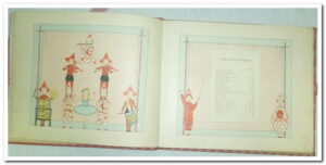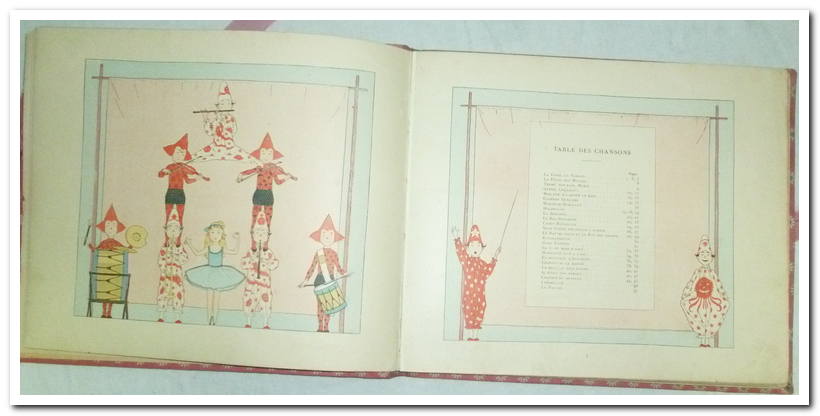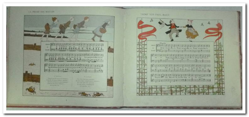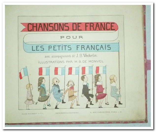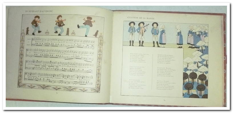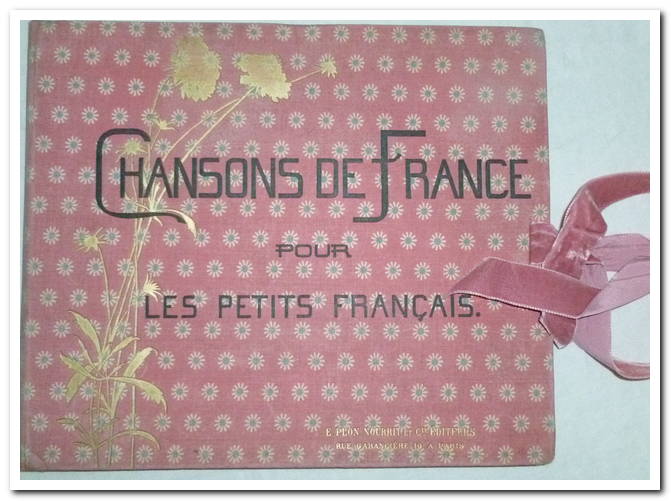 Avec accompagnements de Weckerlin. Illustrations de Maurice BOUTET DE MONVEL. Paris, Plon Nourrit et Cie, 1884, in-4 oblong, toile rouge éditeur illustrée de marguerites et de chardons dorés, tranches bleues, 48 pages. Deuxième album de chansons présentant 24 comptines dont « La pêche des moules », « Le Roi Dagobert », « Cadet Roussele » . Belle esthétique des couleurs, grand sens du dessin avec la « ligne claire » qui prédomine et dont le trait sobre confère au dessin une certaine élégance. Les petits personnages de Maurice BOUTET de MONVEL évoluent dans des frises, formant des ribambelles, encadrant les partitions et les paroles des chansons. (Le Livre de Jeunesse et d’Enfance en France ). Maurice BOUTET de MONVEL travaille ici la représentation en s’inspirant des théâtres d’enfants et se sert de la frise comme d’un élément décoratif. Le sommaire est encadré par une scène de pantomime musicale. L’image encadre le texte et Maurice BOUTET de MONVEL. Bon état, couverture rigide, intérieur propre et frais.