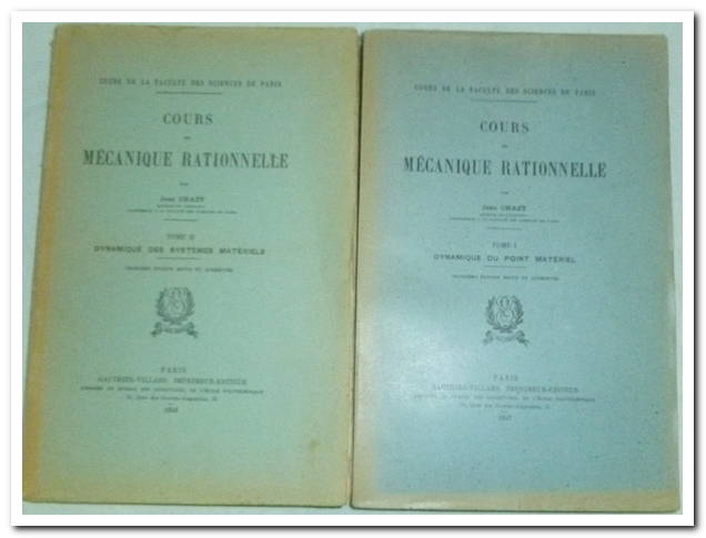 COURS DE MÉCANIQUE RATIONNELLE – TOMES I ET 2. DYNAMIQUE DU POINT MATÉRIEL et DYNAMIQUE DES SYSTÈMES MATÉRIELS / COURS DE LA FACULTÉ DES SCIENCES DE PARIS – 3eme ÉDITION REVUE ET AUGMENTÉE, 1947. In-8. Broché. Bon état, théorie des vecteurs, les principes de la mécanique, theoremes généraux sur le mouvement d’un point matériel, mouvement rectiligne d’un point matériel, mouvement curviligne d’un point matériel, mouvement d’un point matériel sur une courbe, mouvement d’un point matériel sur une surface, mouvements relatifs à la terre. Tome I: 482 pages, Tome 2: 511 pages, un manuel incontournable en mathématiques appliquées et en physique théorique. Couverture souple, intérieur frais et propre, bon état