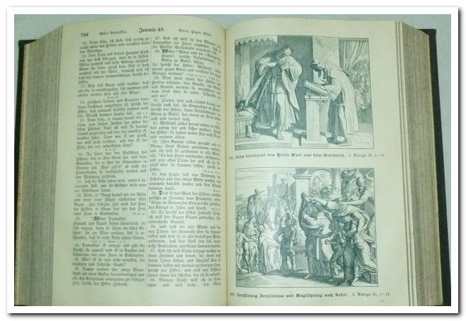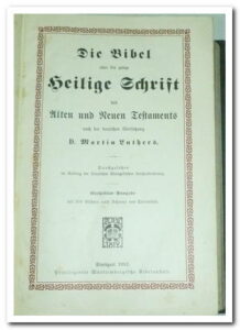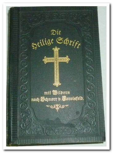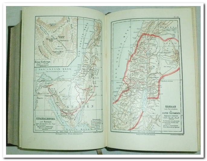 La Bible ou la ganze Heilige Schrift des Alten et Neuen Testaments. Nach der deutschen Übersetzung D. Martin Luthers. Les Apokryphènes. Le Nouveau Testament. Kleinoktavausgabe. 297 pages. Comprend plusieurs cartes en couleurs. Très bon exemplaire. Langue : allemand. Reliure d’origine en toile noire avec gaufrage, intérieur propre et frais, couverture rigide, plusieurs illustrations en noir sur blanc hors texte.
