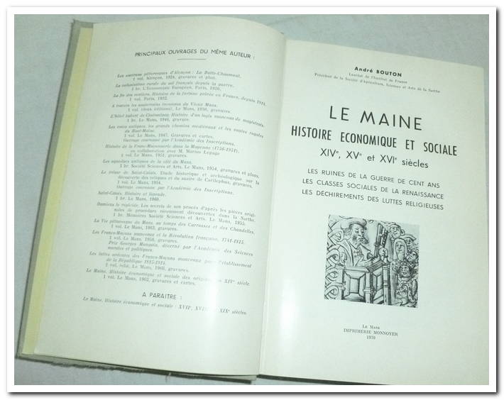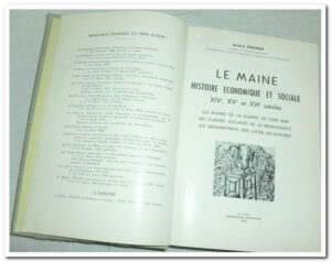 LE MAINE – HISTOIRE ECONOMIQUE ET SOCIALE : XIV, XV, XVIe siècles les calamités de la guerre de cent ans dans le Maine Tirage à 1000 exemplaires numérotés pour cet ouvrage de référence (N°00222). 1038 pages, avec illustrations dans et hors texte. Le Maine : histoire économique et sociale : XIVe, XVe et XVIe siècles. les ruines de la Guerre de Cent ans ; les classes sociales de la Renaissance ; les déchirements des luttes religieuses, couverture rigide intérieur frais, bon état.