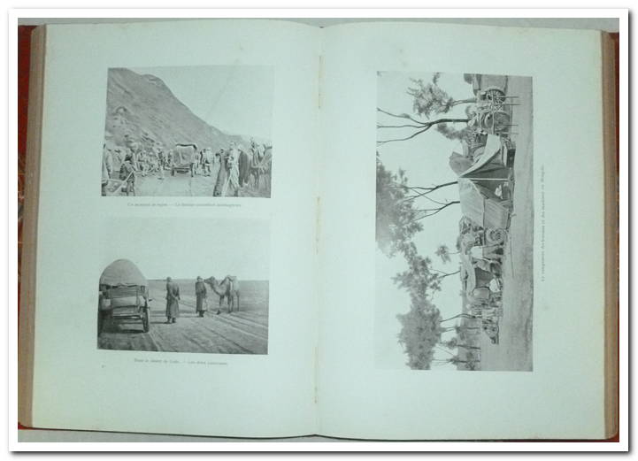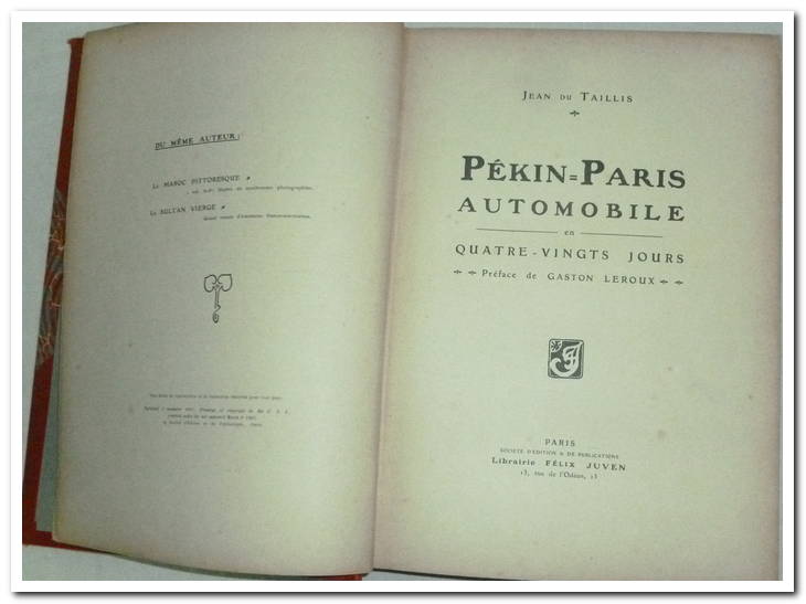 TAILLIS Jean, Pékin Paris, Automobile en Quatre-vingt jours. A Paris, Société d’Édition et de Publications Librairie Félix Juven, 1907. Format in-4, de couleur orangé, titre au dos et sur le plat supérieur, toutes tranches dorées, 318 pages. Préface de Gaston Leroux. Accompagné de 39 feuillets incluant des impressions photographiques. Parcours en 2 étapes : 1) à travers l’Asie de Pékin à Kiakta, puis 2) du lac Baïkal à Paris en passant par Berlin et Aix-la-Chapelle. Journaliste pour Le Matin et Le Figaro, Jean du Taillis se lance en 1907 avec 4 autres équipages dans la folle aventure d’une traversée de 16.000 kilomètres à bord d’automobiles. Un défi peu commun les attend puisqu’il s’agit de relier deux points aux antipodes l’un de l’autre, Pékin et Paris en traversant le désert de Gobi et les steppes de la Sibérie. Des programmes de réception sont prévus tout du long du parcours. Y participent le Prince Scipione Borghese, Jean Collignon, Auguste Pons, Georges Cormier et bien sûr Jean du Taillis avec son acolyte Charles Godard, salis, charnière intérieure du plat inférieur travaillée, bon état. Cartonnage percaline, couverture rigide, intérieur frais et propre.