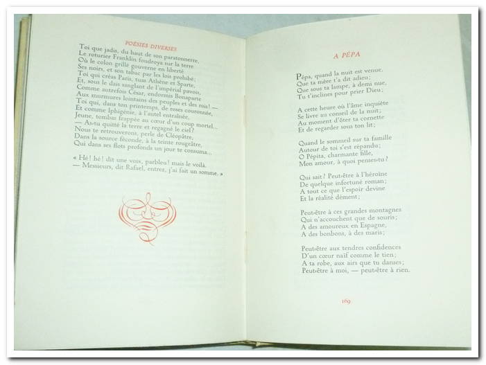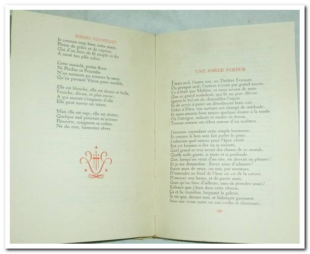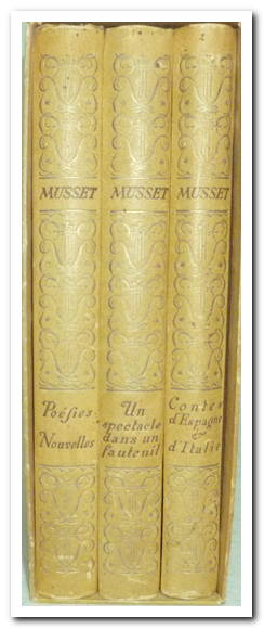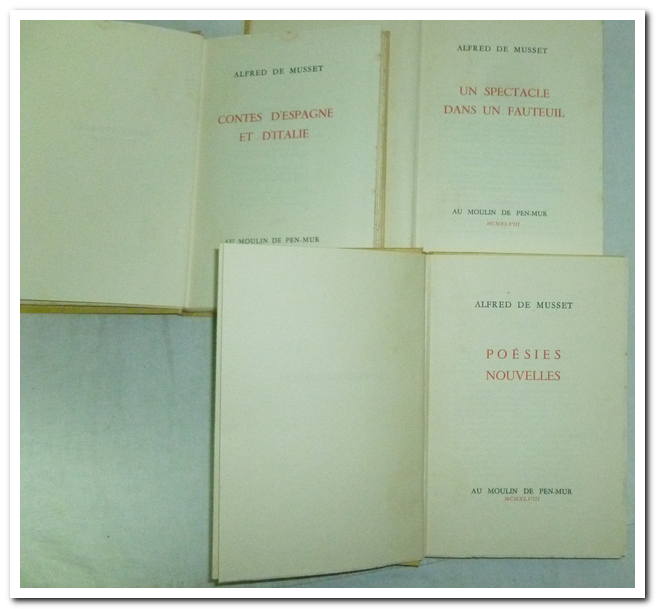 1948. Coffret de 3 ouvrages d’Alfred Musset . In-12. T1: 232 pages ; Contes d’Espagne et d’Italie. Très état ; intérieur propre et frais, en bon état, titre en rouge. T2: Un spectacle dans un fauteuil, 257 Pages, non coupées, couverture rigide, intérieur très propre et frais, très bon état, illustrations en rouge dans le texte. T3: Poésies nouvelles, 267 Pages, titre en rouge, couverture rigide, intérieur propre et frais.