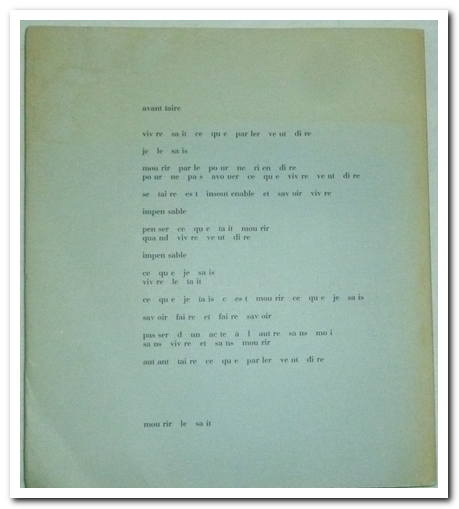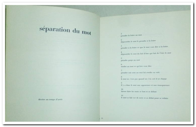 Paris, Spiess et Nane Stern, 1984. In-8 carré broché sous couverture grise imprimée rempliée, 120 pages. Édition originale tirée à 1000 exemplaires, 2e trimestre. Livre d’artiste entièrement typographié, couverture souple, intérieur frais et très propre. Très bon état.
